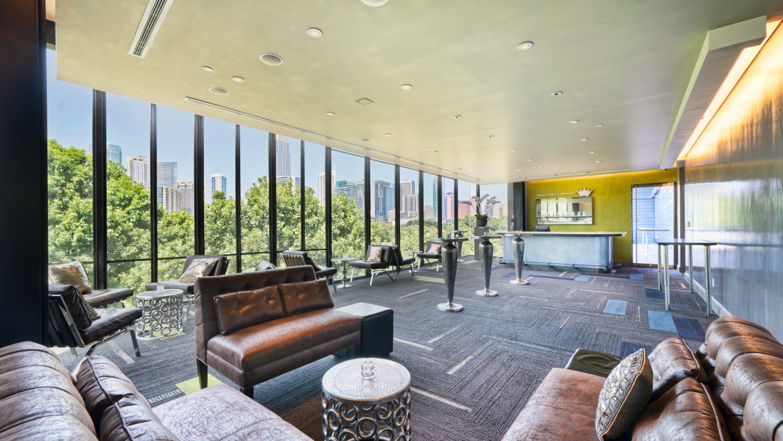 Features: Customizable DREAM sign, sophisticated lounge furniture, built-in bar, grand piano, small stage, two 40-inch screens, built-in speakers, microphone, and floor-to-ceiling windows with a scenic view of Town Lake. Full TABC liquor license.